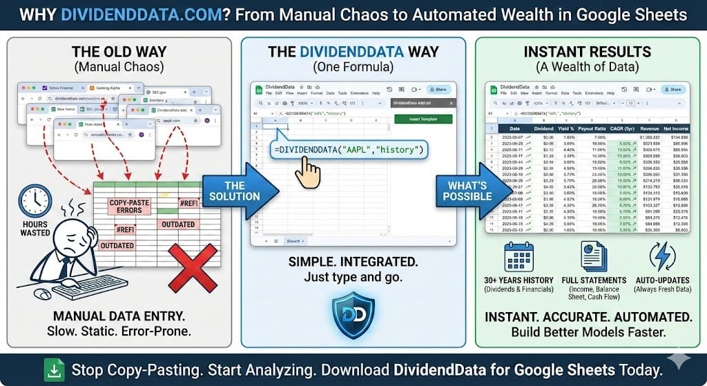 I’ve spent months building in secret. Now, Dividend Data for Spreadsheets is finally ready. Available on Google Sheets and Microsoft Excel.